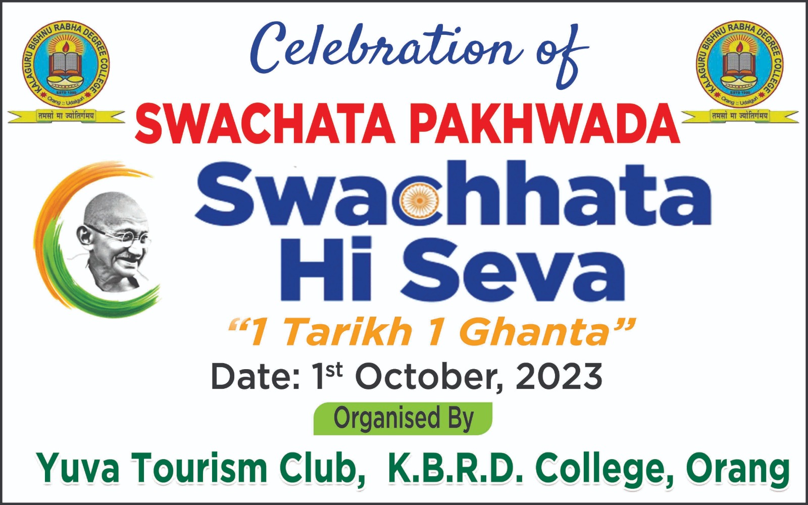 It is hereby notified to all the Students and Employees of the College that the NSS Unit and Yuva Tourism Club of the College has organised the Swachhata Pakhwada and Swachhata Abhiyan as well as Ek Tarikh , Ek Ghanta in the College on 1st October,2023 to commemorate the NSS Day and Gandhi Jayanti..